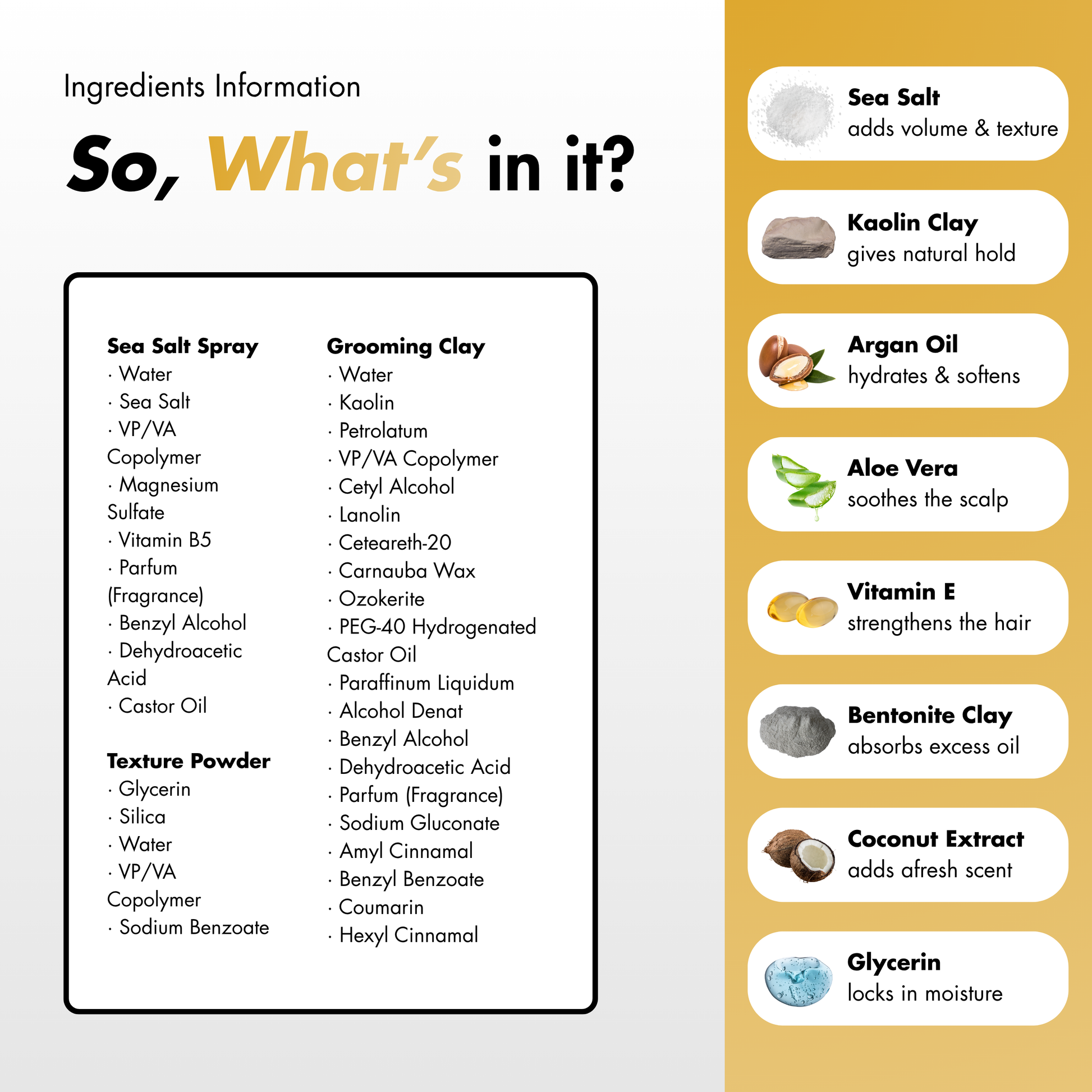 🎯 Grooming Clay: Create a messy, textured style with strong hold and a matte finish. Adds volume and structure for an all-day, natural look.